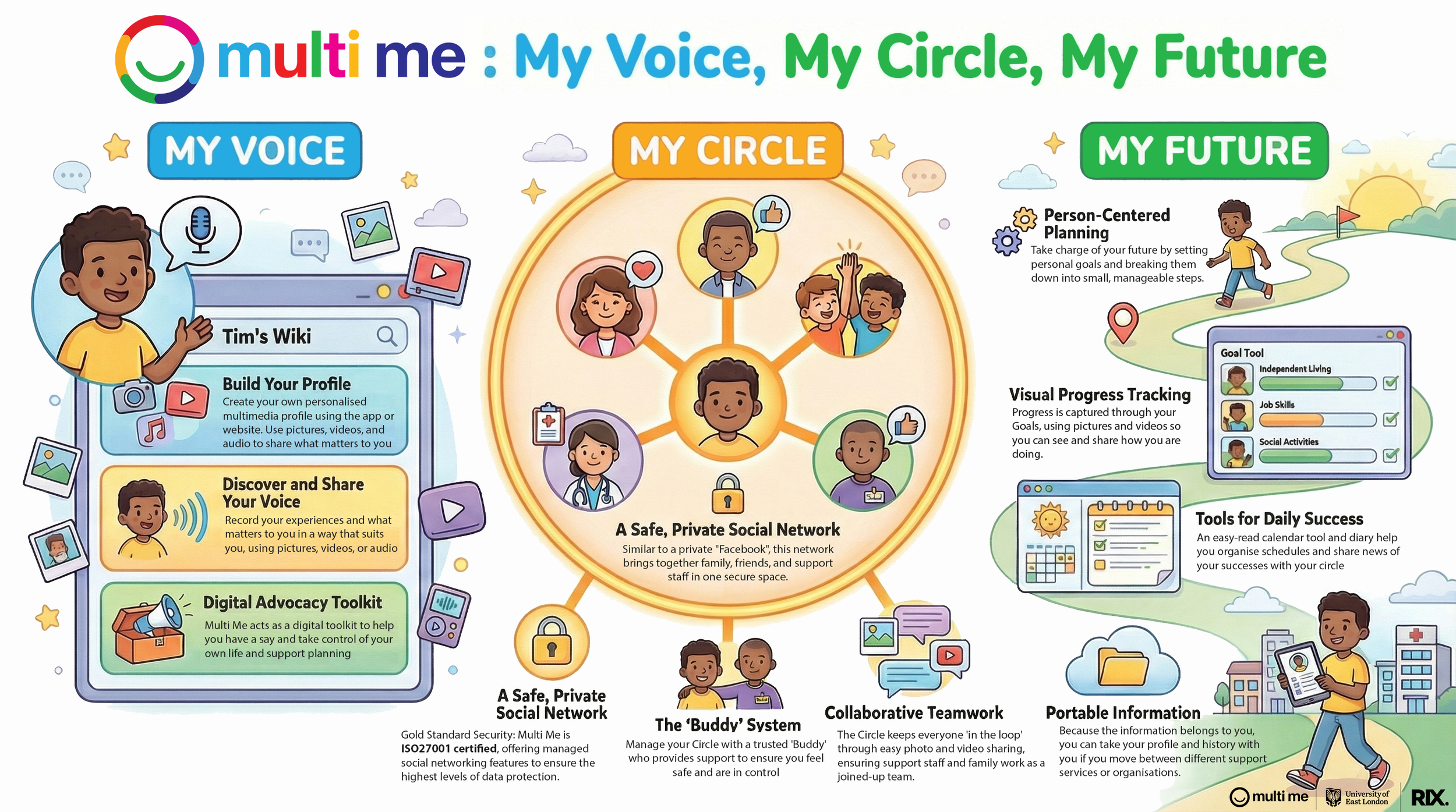 From everyday experiences and support needs through to long-term goals, Multi Me helps build a shared, living picture of a person — improving understanding, communication, and outcomes.