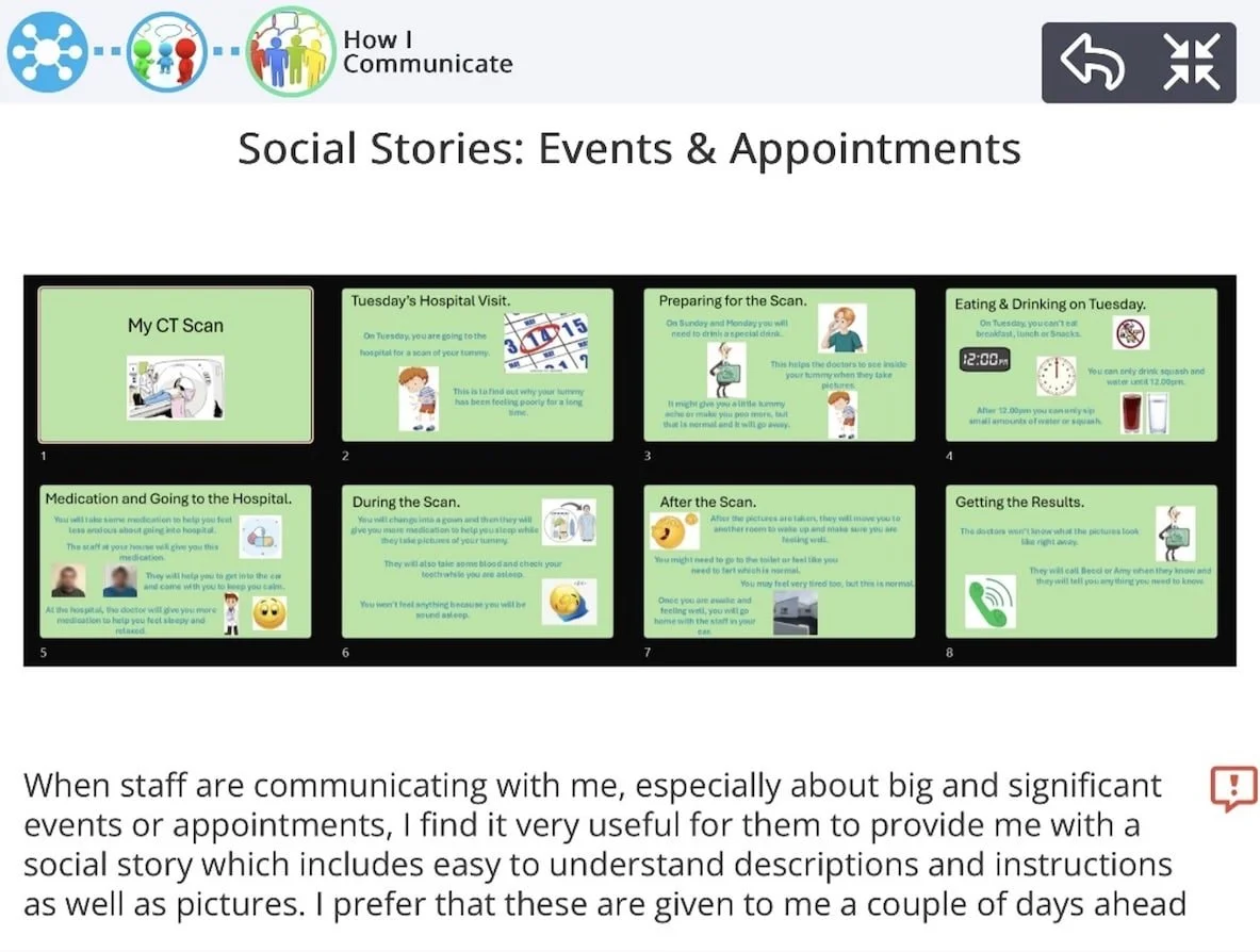 The information in the ‘About Me’ section of his support plan (Multi Me WIKI) helped with essential planning for his hospital appointment. Wikis are accessible, and easy to build personal websites. They can be used to create multimedia person-centred plans that use pictures, words, video and sound to capture the aspirations and needs of the individual.